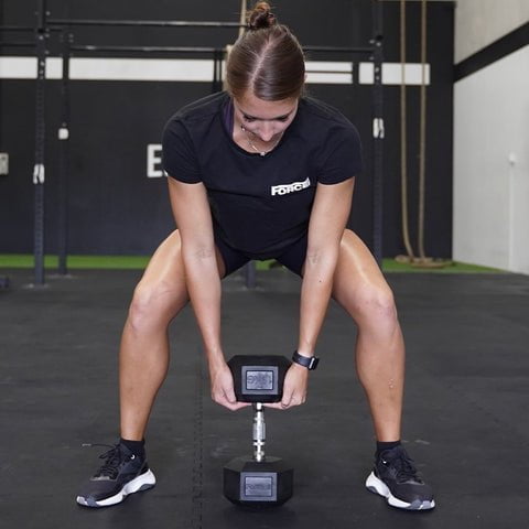 14 x pairs of Force USA Rubber Hex Dumbbells (1-20kg / 2.2lbs-44lbs), featuring hexagonal ends to prevent rolling, easy-to-read weight numbers and rubber coating to reduce noise.