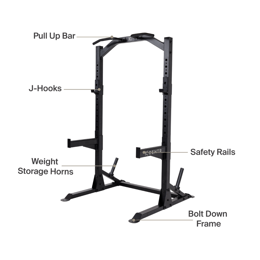 ADJUSTABLE SAFETY RAILS FOR SECURE TRAININGThe Centr Half Rack includes 16 vertical safety rail positions with 3-1/8 inch (79.5 mm) increments, allowing you to customize the rack height for any exercise. The replaceable wear guards protect both the frame and your Olympic bar, ensuring safe, reliable lifts every time you train. |