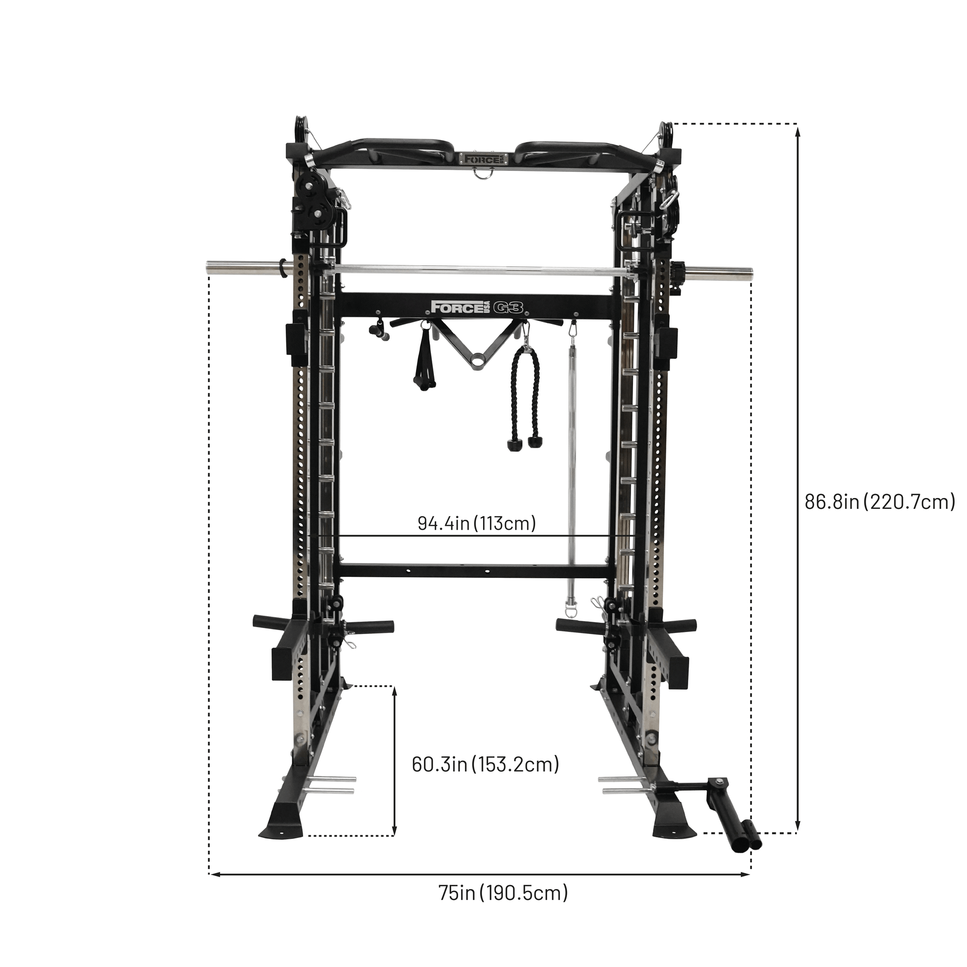Introducing the all-new Force USA® G3® All-In-One Trainer, your ultimate strength and fitness solution! With a host of upgraded features and attachments, this compact powerhouse will transform your home workouts like never before. Get ready to experience the incredible versatility of the Smith Machine, Functional Trainer, Power Rack, Core Trainer, Multi-Grip Chin-Up Station, plus optional Upgrade Kits, all in one sleek home gym unit.