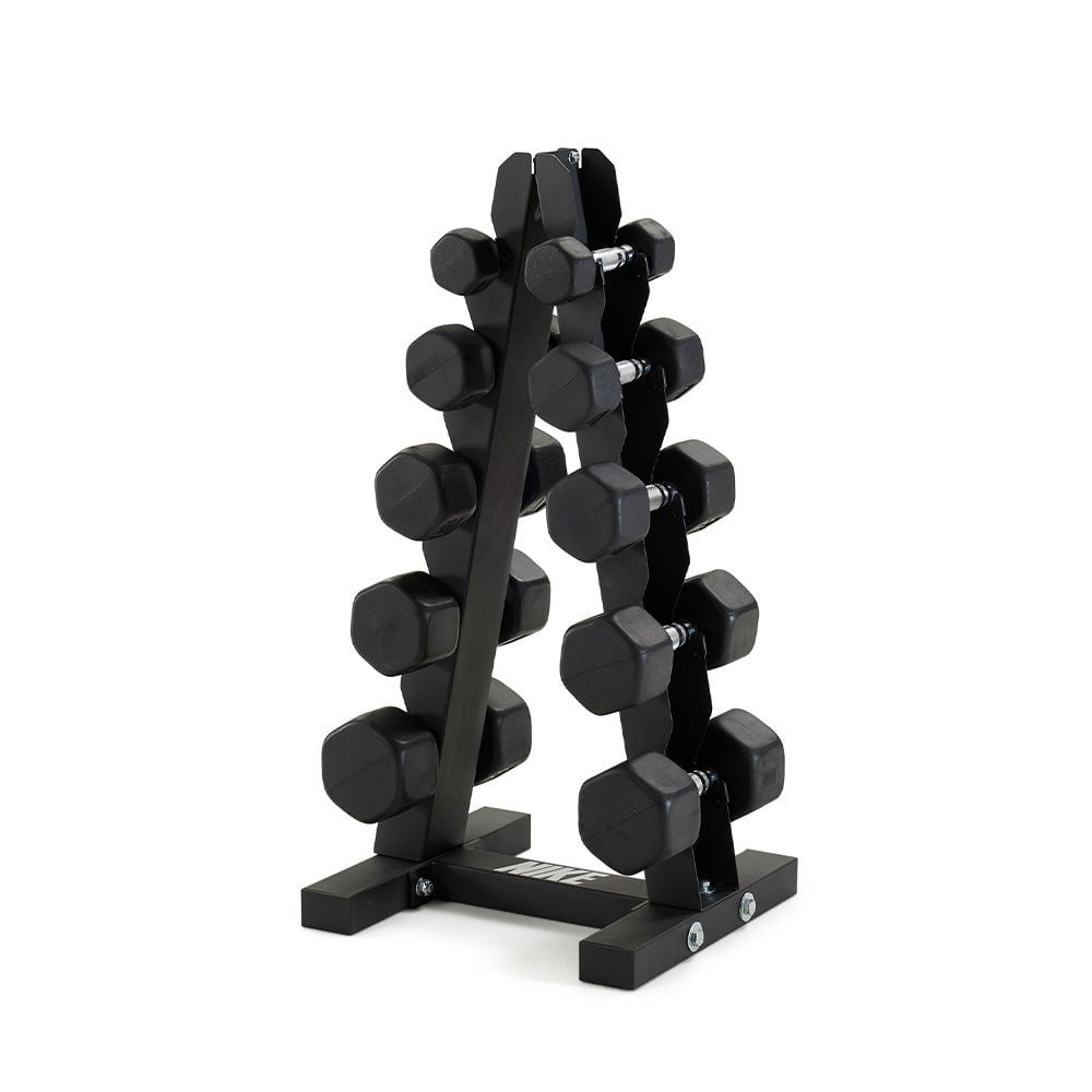 SMART STORAGE WITH BUILT-IN PROTECTIONThe Nike Strength Dumbbell Tree features a compact vertical design that holds up to 5 pairs of dumbbells, making it perfect for smaller spaces and tidy gym setups. Integrated nylon padding protects dumbbell handles from scratches and wear, helping extend the life of your equipment while keeping your space organised. |
