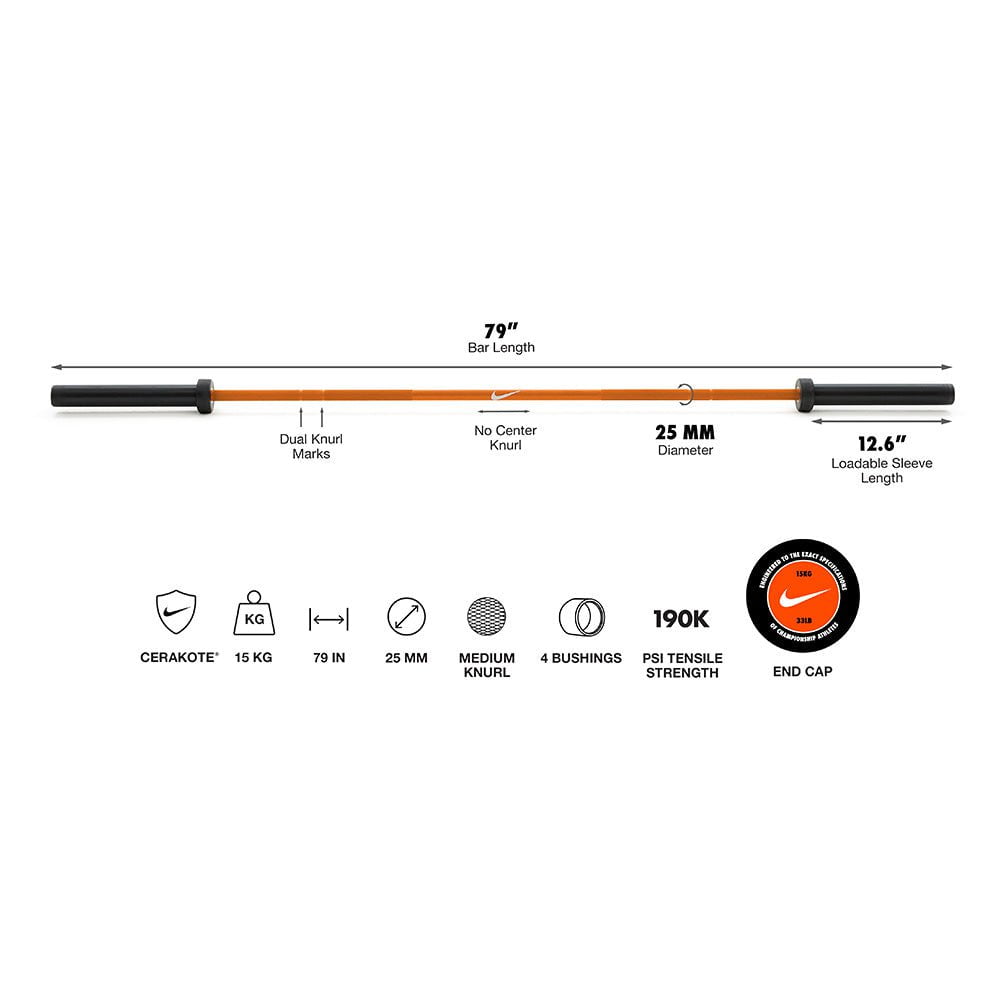 Designed for versatility and durability, the Nike Strength Shield Barbell (15kg) is the ultimate training bar for lifters of all levels. Engineered with a Cerakote® finish, this bar resists corrosion, scratches, and wear, ensuring long-lasting performance in even the toughest gym environments. Featuring a 25mm shaft, medium volcano knurling, and dual knurl marks, this bar provides a secure grip for Olympic lifts, powerlifting, and functional training. With four premium bushings, the sleeves rotate effortlessly, delivering smooth and controlled movements. Whether you're training at home or in a commercial gym, this barbell is built for strength, precision, and style.